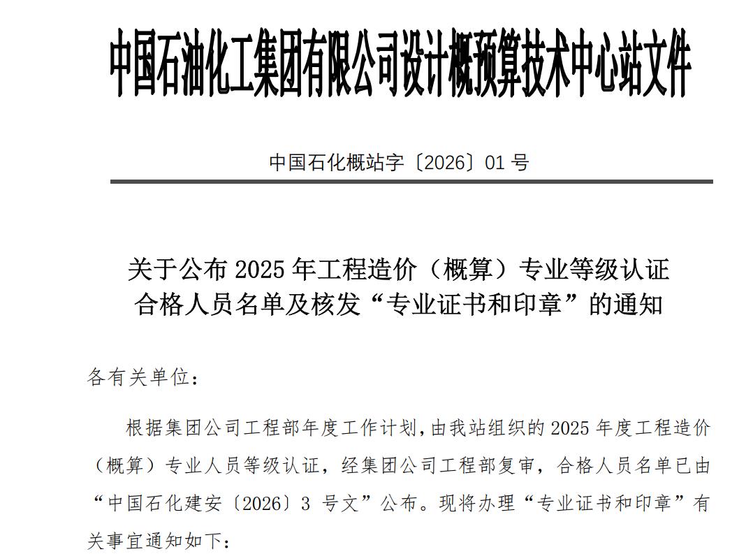 关于公布2025年工程造价(概算)专业等级认证 合格人员名单及核发“专业证书和印章”的通知